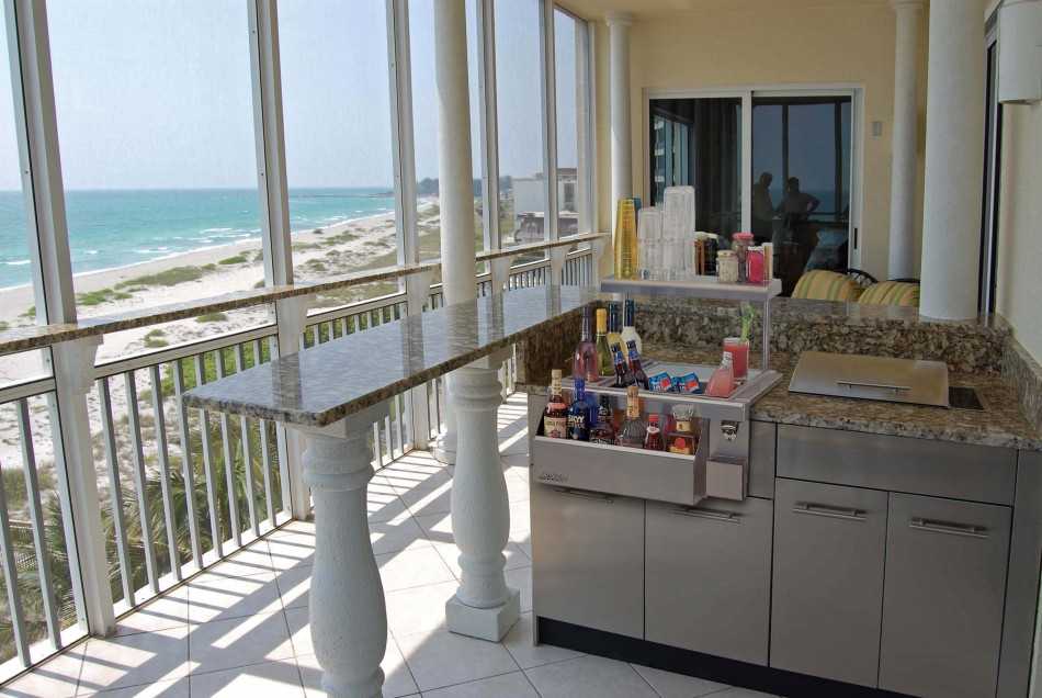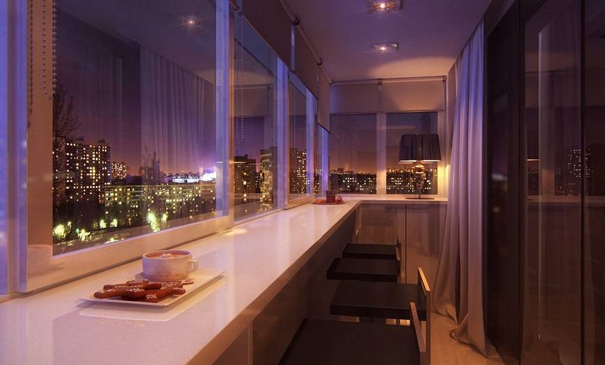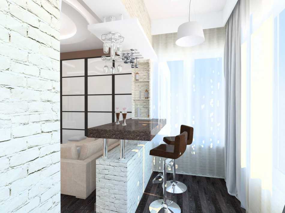 Красиво смотрится барная стойка с комфортной зоной отдыха на балконе. Для этого подоконник переделывают в столешницу, устанавливают барные стулья. Если позволяет место, то устанавливают небольшой диванчик или кресла с кофейным столиком. Для маленьких кухонь хорошее решение – вынос на балкон холодильника. За счет этого освободятся квадратные метры.
