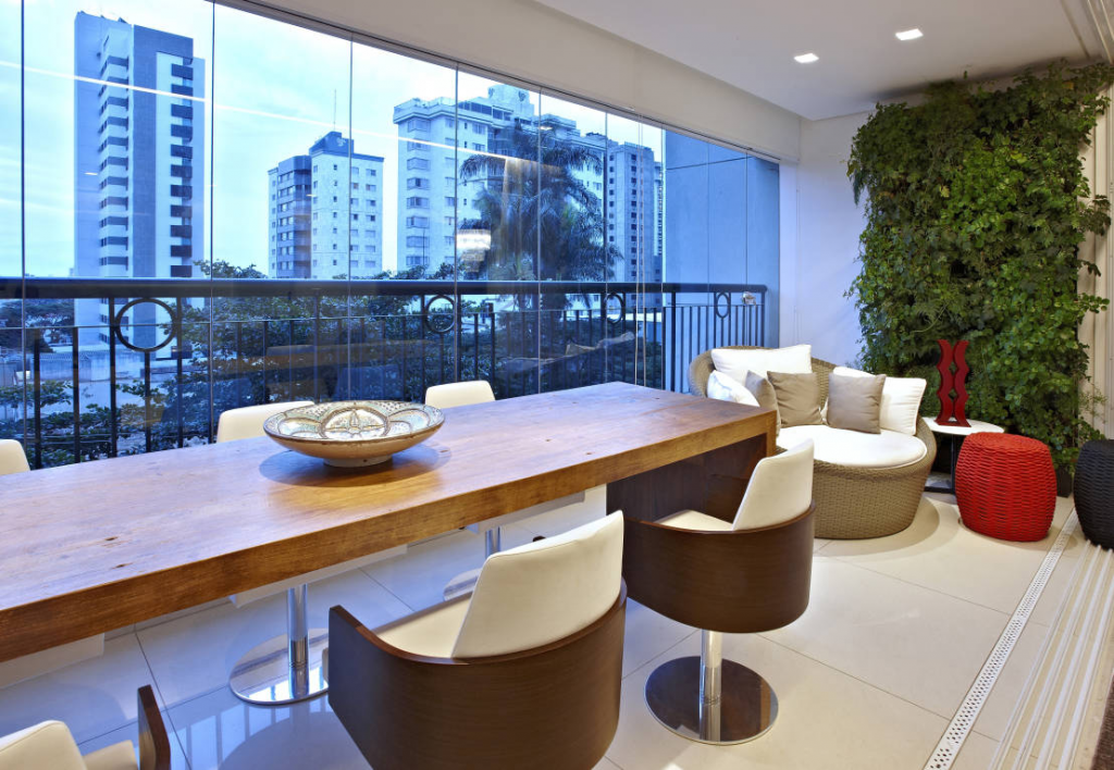Хороший вариант — вынести столовую на балкон. Таким образом получится не только расширить пространство, но и добиться необычного дизайна помещения, особенно если установлено панорамное остекление. В данной зоне нужно грамотно проработать освещение и расположить его над столом.