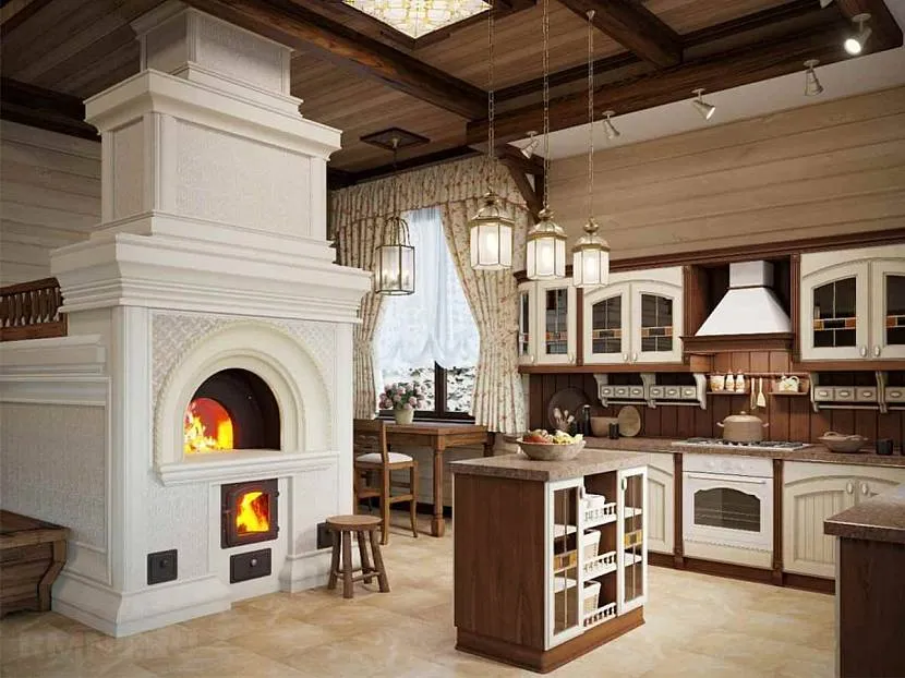 - Рустикальный стиль, или русский кантри. Особенно хорошо такой интерьер смотрится в домах из бруса. Для таких дизайнов характерно применение дерева в отделке и мебели, использование мягких природных оттенков. Декоративные элементы в виде резных деталей и традиционных узоров делают интерьер более колоритным. Особенно хорошо на кухне в рустикальном стиле смотрится печка.