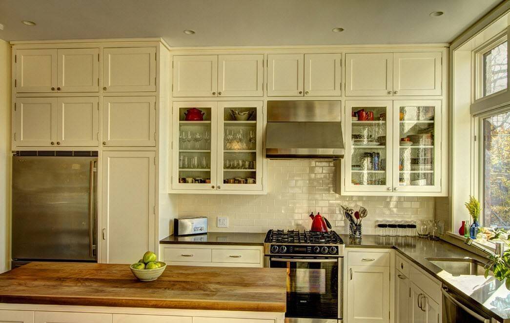 Они придадут кухне просторный и воздушный вид. Массивные карнизы и гардины следует вычеркнуть для зрительного увеличения габаритов кухни и обеспечения её хорошим освещением.