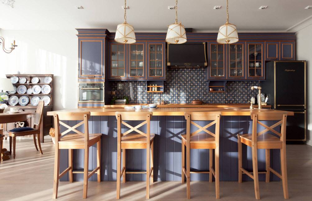 Русский. Заключается в отражении вида старинной избы. Обязательно на кухне должна быть печка, оснащенная дымоходом. Стены не стоит красить, сделайте их фактурными. Это добавит комнате теплоты и уюта. Пол оставьте деревянным. Чтобы зимой было не холодно по нему ступать, расположите коврик.