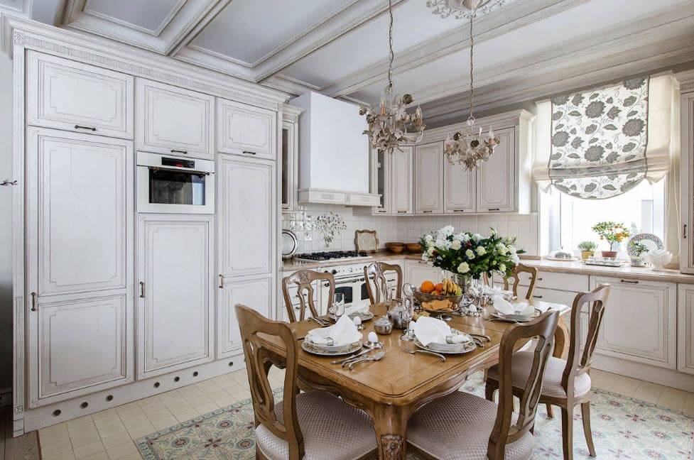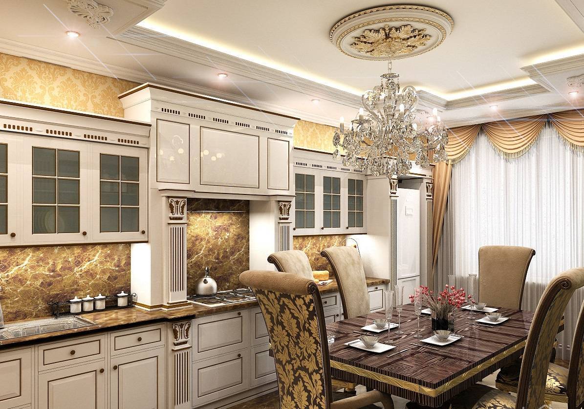 Классический. Данный стиль придаст вашей кухни атмосферу роскоши, не выходящей за рамки разумного. Мебель, собранная из массивов дерева с коваными из металла деталями – особенность этого стилистического решения. Классический стиль отлично подойдет для кухни, совмещенной с гостиной. В цветовом оформлении должны доминировать песочные, белые и бежевые оттенки, в сочетании с золотистым цветом. Также необходимой деталью является массивные карнизы с гардинами.