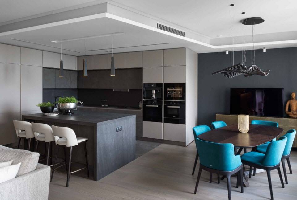 В кухне, совмещенной с гостиной, особое внимание нужно уделить разделению пространства на зоны. Это можно сделать с помощью предметного, или визуального разбития помещения. Для первого варианта подойдет расположение мебели, раздвижных конструкций, в крайнем случае можно использовать перегородку