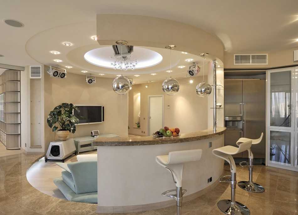 - Можно копировать изгибы подиума на потолке при помощи гипсокартона. Светильники, которые будут свисать на длинных шнурах, отлично справятся с задачей зонирования.