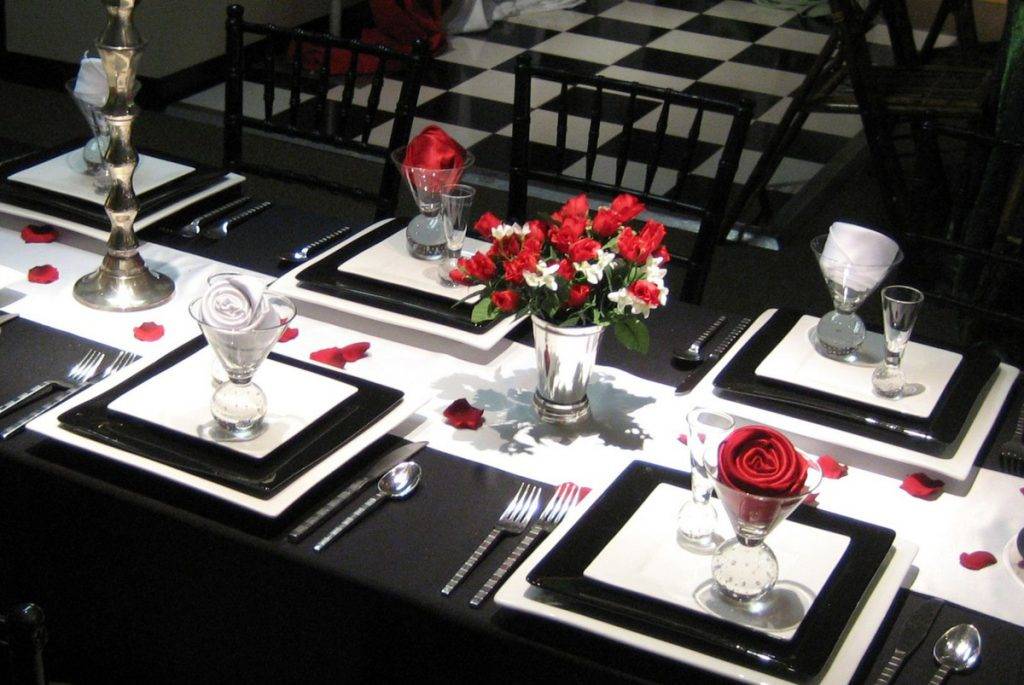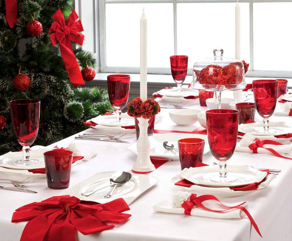 Нежность белого и страсть красного оттенка — красивое и традиционное сочетание контрастов. Оно никогда не выходит из моды и довольно простое в оформлении. Стол застилается красной скатертью, могут быть белоснежные салфетки с красными кольцами или наоборот, красные салфетки на белом фоне.