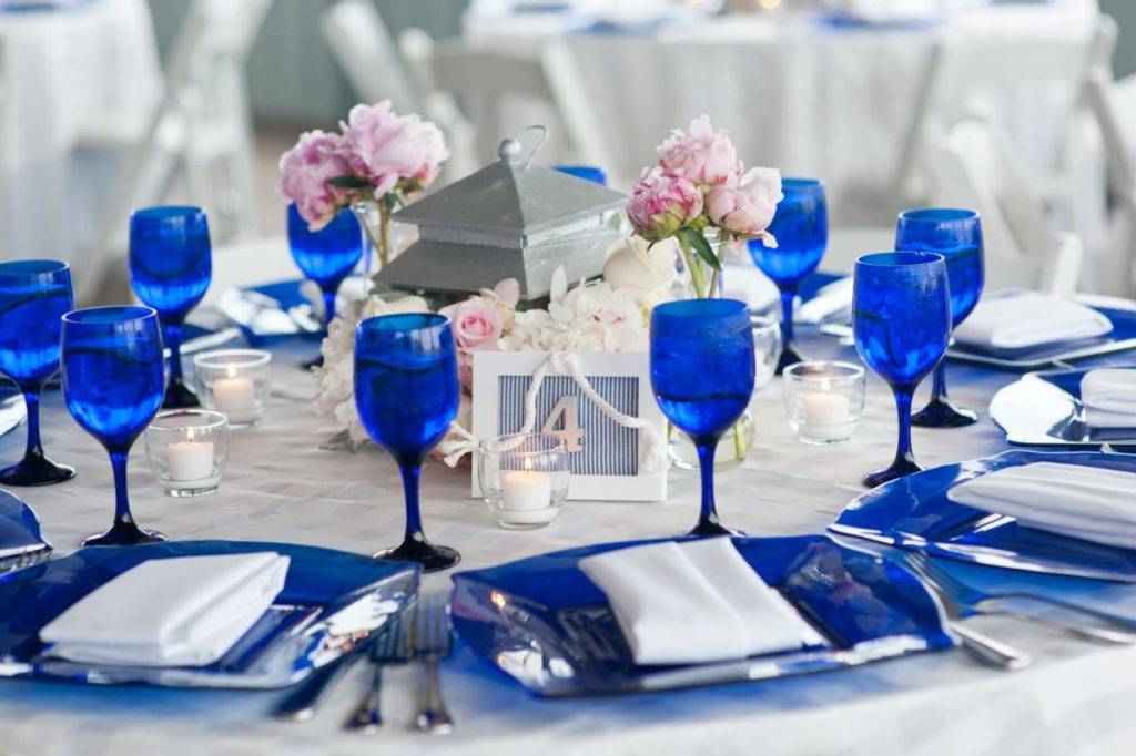 Синий цвет в оформлении стола поможет реализовать разные тематические идеи, такие как синева неба или голубизна горных рек. Незаменимым акцентом любого праздничного стола является букет сезонных цветов, которые создадут гостям хорошее настроение.