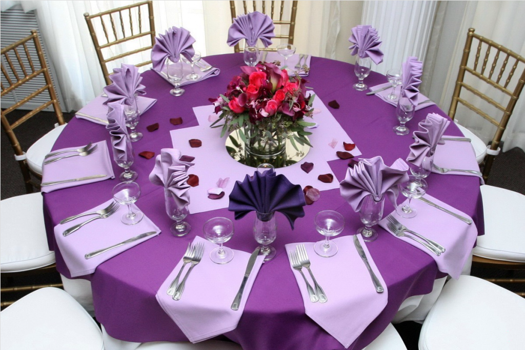 Украшение стола в монофиолетовой палитре выполняют редко, так как смотрится это довольно просто. Однако дизайнеры утверждают, что фиолетовый будет удачно сочетаться с другими оттенками.