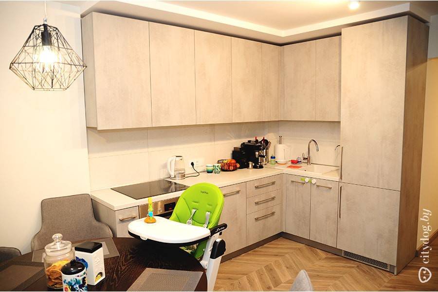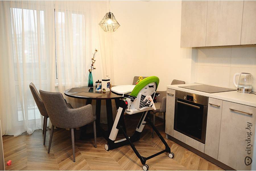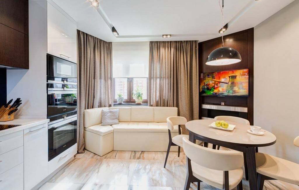 В помещении с небольшой кухонной зоной остается еще достаточно места для организации места для отдыха.