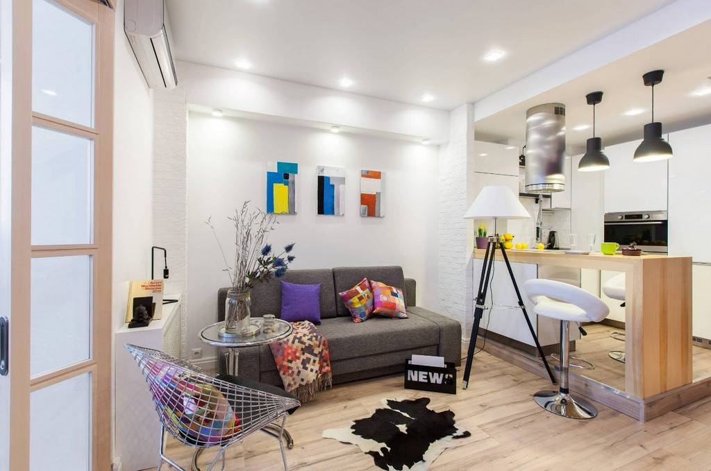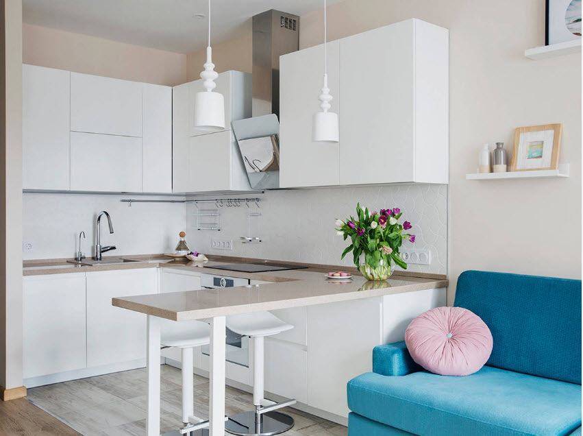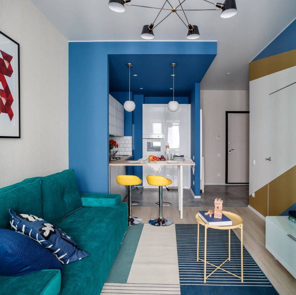 Такой стиль подойдет для ярких или активных натур. Зона кухни с идеальными геометрическими формами гарнитура перекликается с простым и стильным диваном. А современные бытовые приборы соседствуют с отделкой из стекла или металла. Чтобы выделить зону отдыха будет достаточно постелить однотонный ковер без узоров.