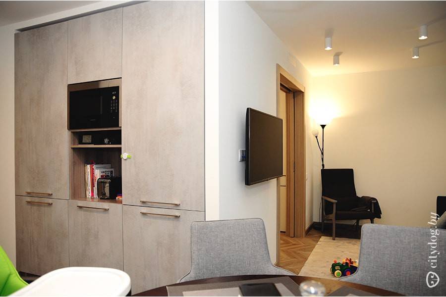 - Под телевизором размещена длинная и узкая варочная панель, которая позволила уменьшить глубину кухонных модулей со стандартных 60 см до 55 см.