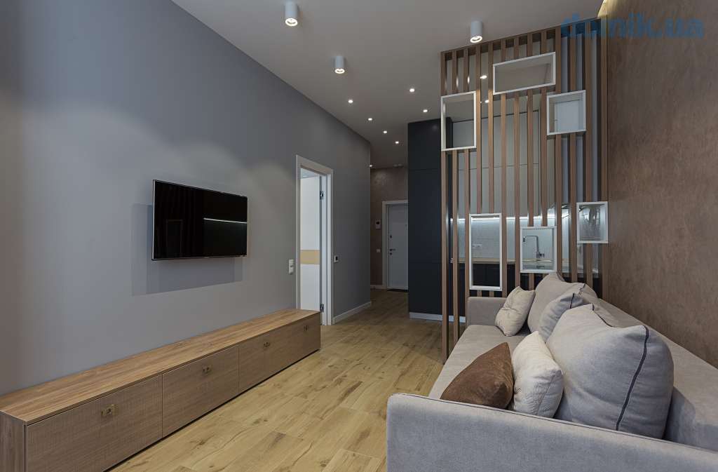 Разделение зон происходит размещением между комнатами обеденного стола, барной стойки или дивана. Некоторые стилистики предусматривают даже установку небольшого прозрачного стеллажа – с полками, но без задней стенки.