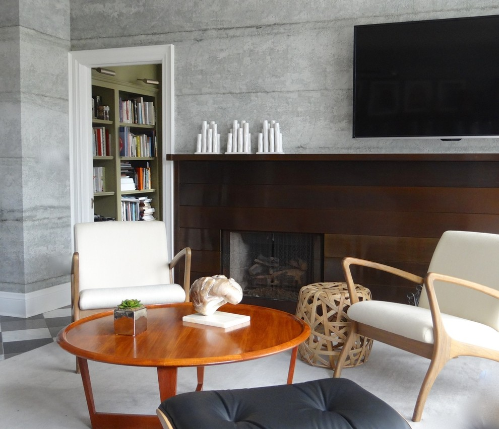 Совет! Стена с «бетонной» отделкой в гостиной может выделять какую-либо функциональную зону – каминную, диванную, столовую и пр.