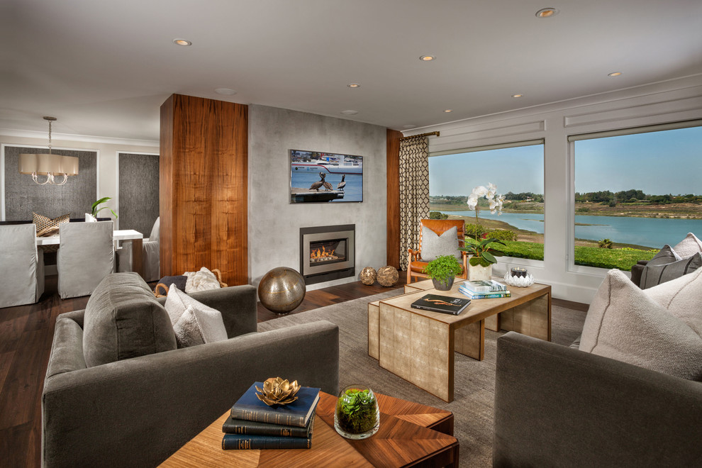 В гостиной, где стены или их часть декорированы обоями под бетон, легко создать уникальный интерьер, используя подобную отделку в качестве нейтрального фона, подходящего под самые разные стили.