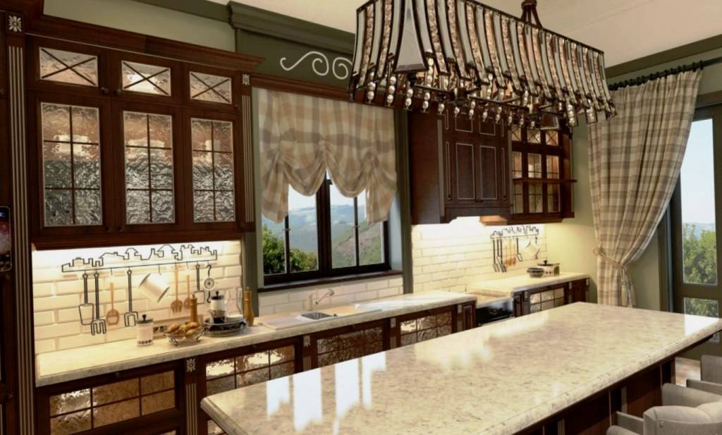 Украшение мебельных фасадов пилястрами и резьбой на девятиметровой кухне неуместно. Для балюстрад необходимо габаритное помещение. А вот развешенные по окнам многослойные шторы с ламбрекенами, считается самым, что ни есть, английским декором в интерьере.