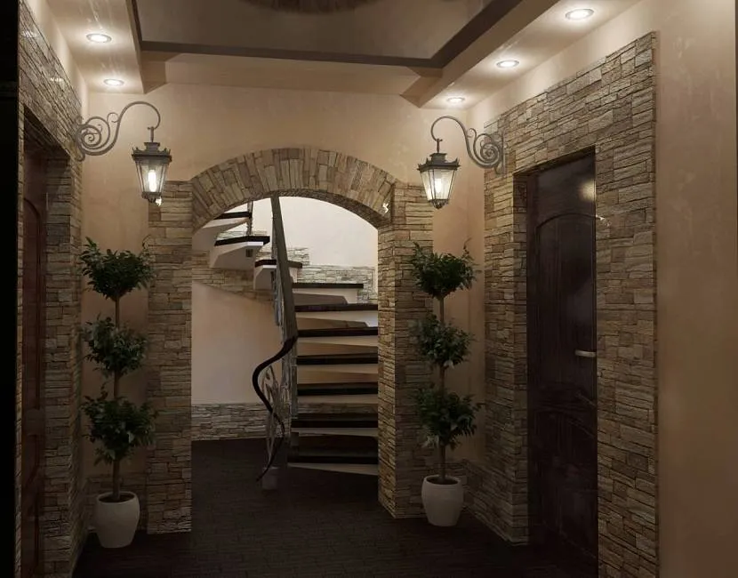 Шале – отличается применением природных материалов (древесина, камень, глина). Акценты в таком коридорчике расставляют текстильные детали изо льна и хлопка, а на полу могут разместиться коврики из меха или грубой шерсти.