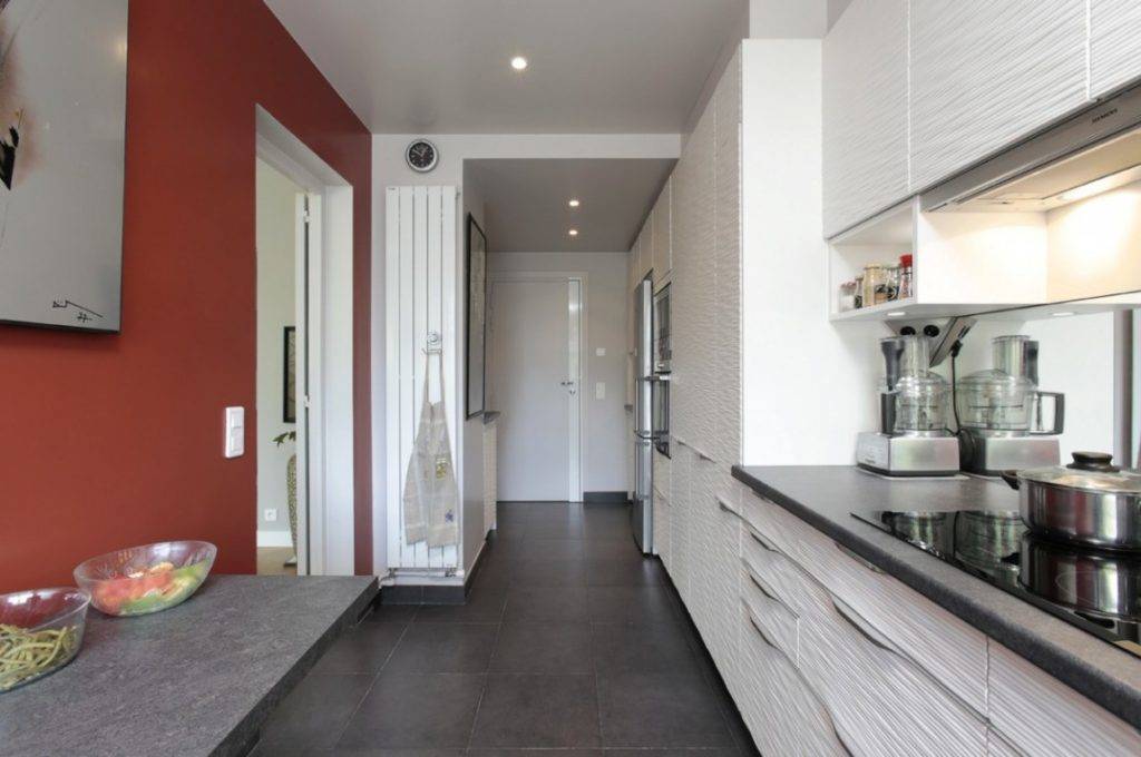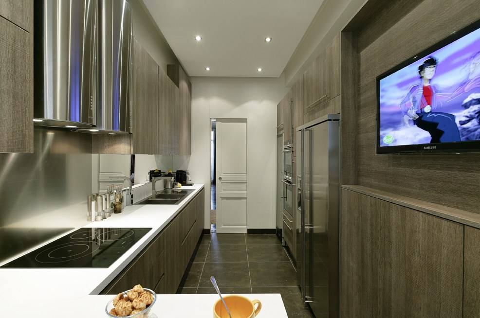 Параллельная кухня или двухрядная планировка кухонного гарнитура подходит для широких коридоров. Мебель и техника устанавливается в два ряда по длинным стенам помещения. Обеденную зону здесь организовать сложнее, зато проще выстроить рабочий треугольник. Чтобы кухонный гарнитур был менее заметным, выбирают шкафы с дверями-гармошкой;