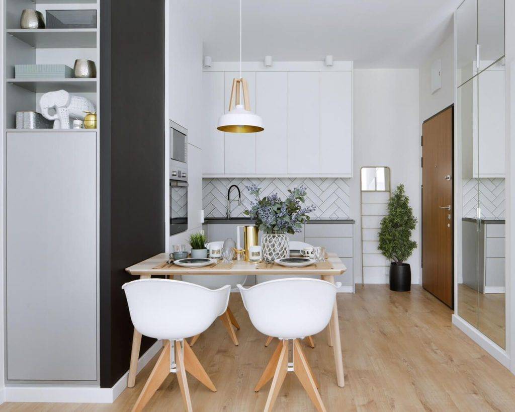 - Увеличение полезной площади. Благодаря отсутствию перегородки и дверного проема появляется возможность использовать освободившееся место для размещения мебели. Можно установить дополнительную кухонную тумбу или увеличить пространство гардероба.