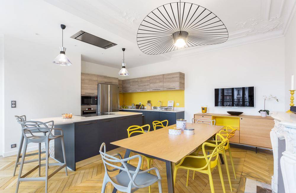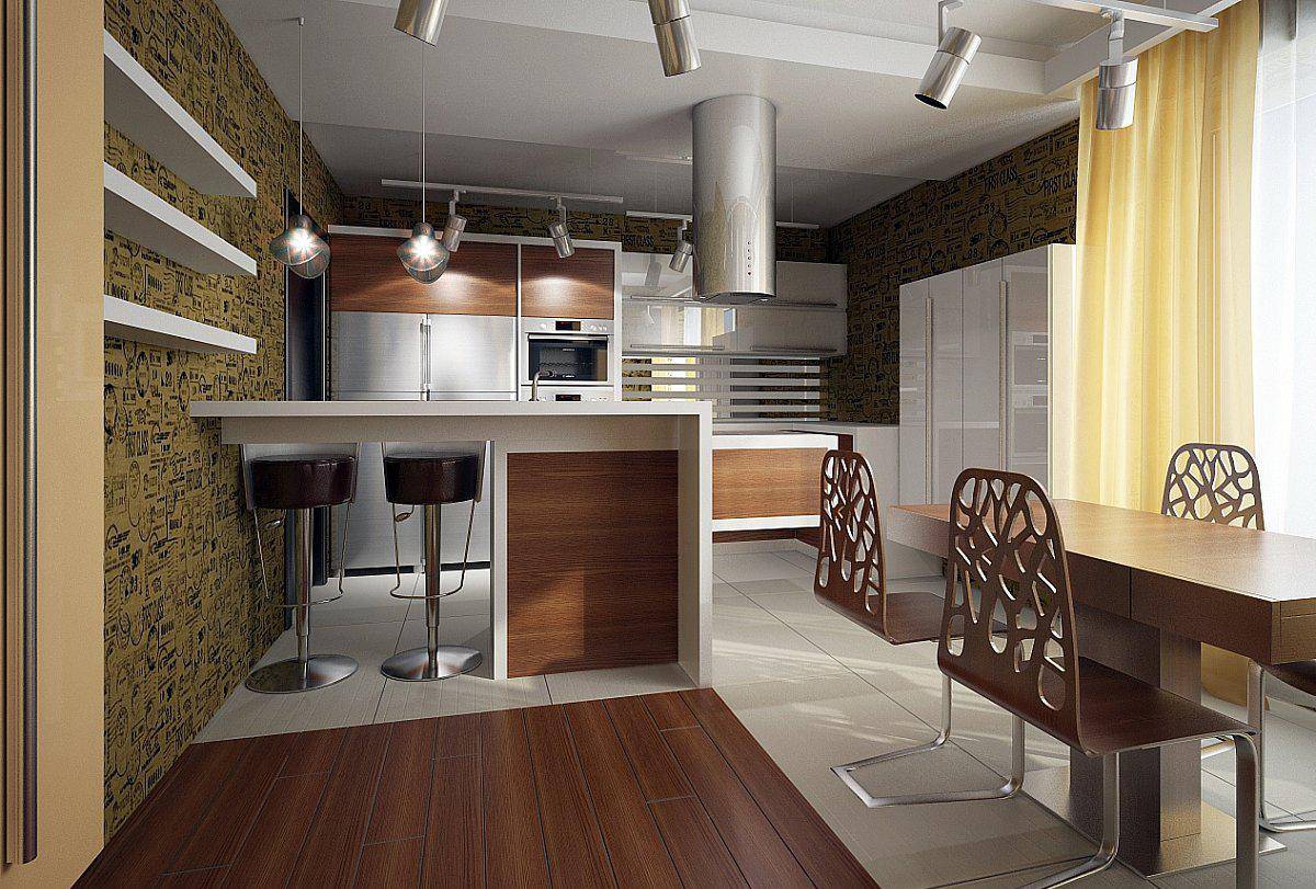 Красиво будет смотреться интерьер, разделенный на несколько зон. Обычно кухню делят на рабочую зону и столовую. Это можно оформить с помощью цвета и освещения. Если метраж большой, разбейте пространство на две части барной стойкой. При совмещении с гостиной нужно решить, где правильно поставить диван, на какой стене будет висеть телевизор. Для него тоже выводят розетку и кабель.