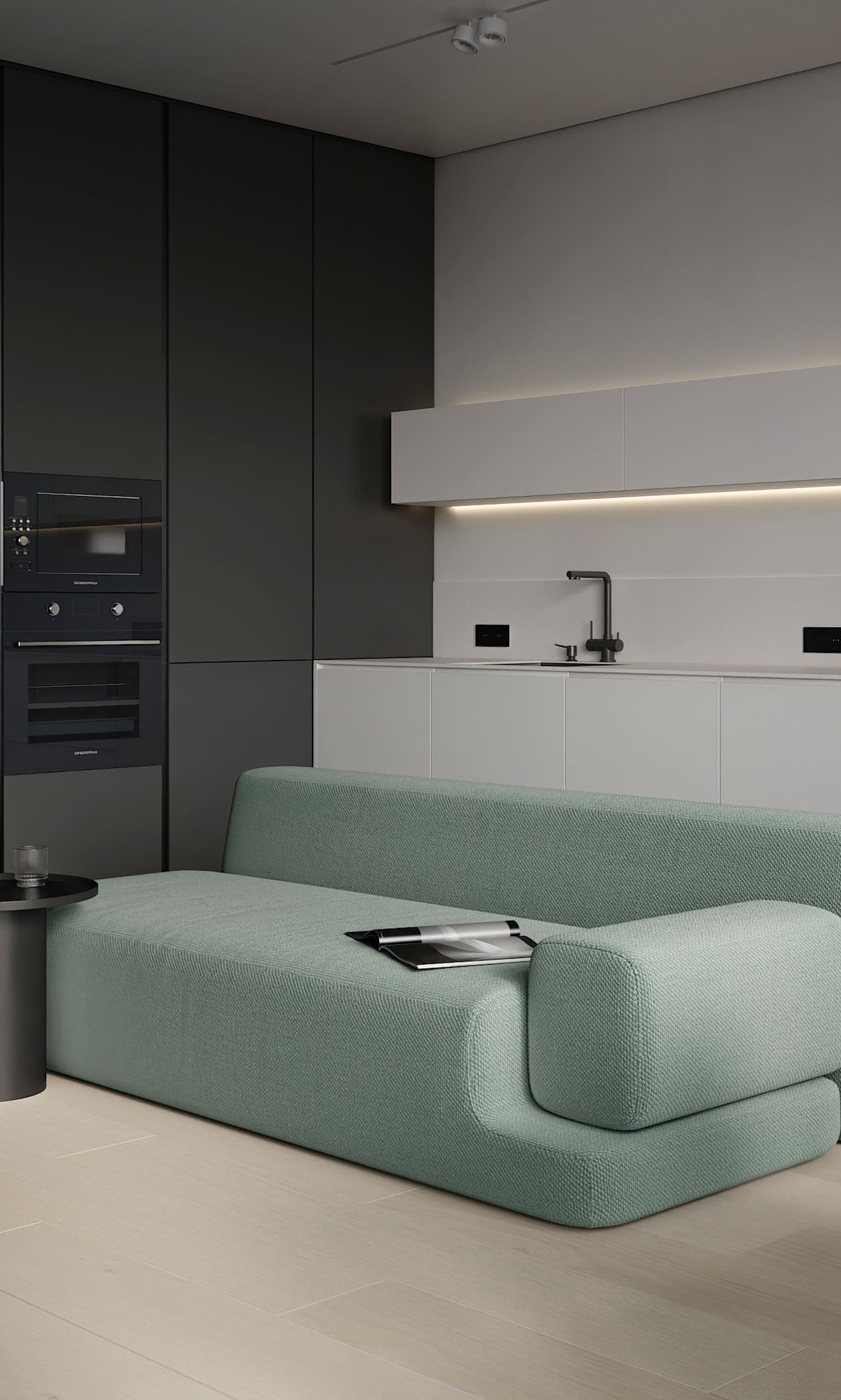Обивка бутылочного цвета не слишком привлекает внимание и вписывается в «зеленый» дизайн кухни с диваном