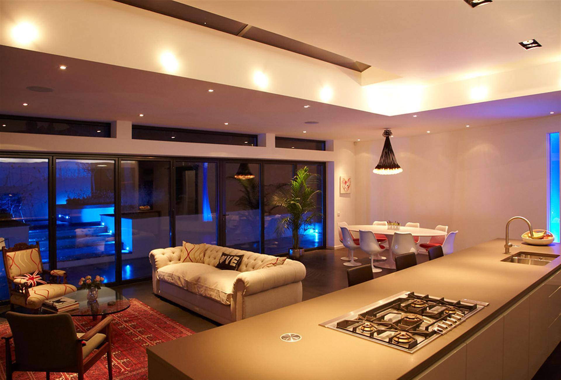 Если нет желания устанавливать перегородку между зоной готовки и залом, как отделить кухню от гостиной подскажут световые акценты. Более яркое освещение делают в месте приготовления пищи, чтобы четко контролировать процесс. Для отдыха и общения подойдет мягкий, рассеянный свет.