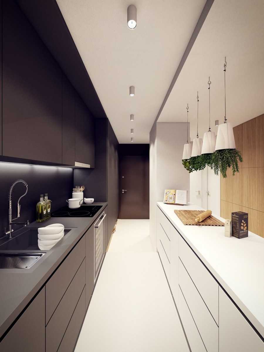 Если пространство узкое и ограниченное, как в небольших домах или квартирах, планировка в варианте коридора часто является единственно возможным видом дизайна. Здесь две стены со шкафчиками обращены друг к другу. При этом размещаются все необходимые приборы.