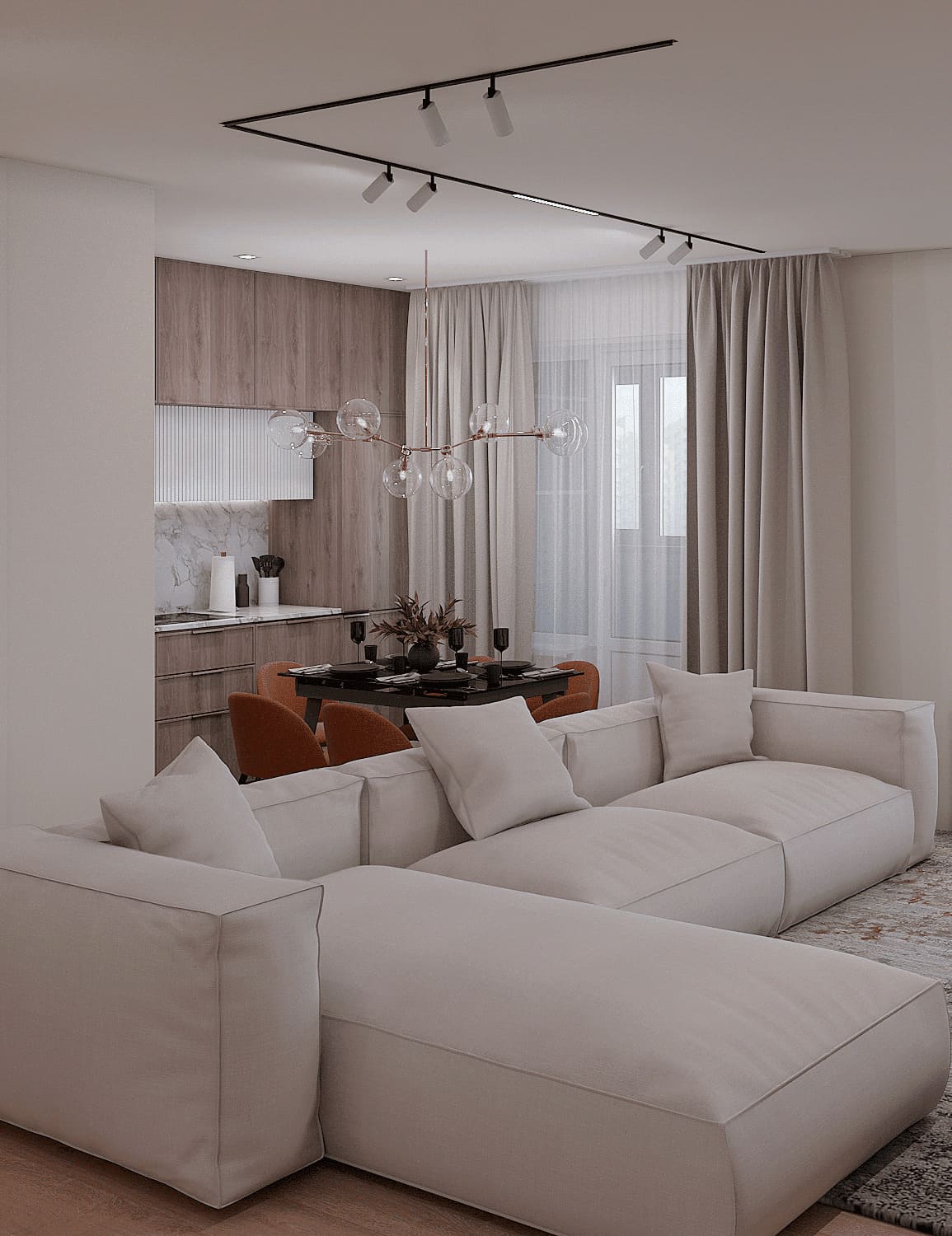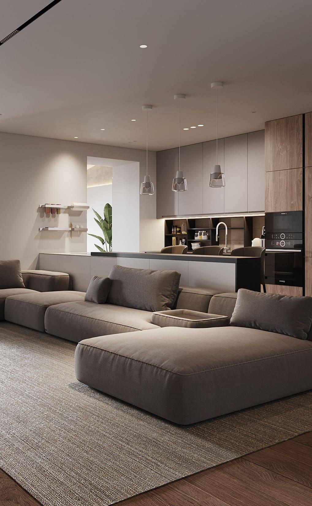 Выбирая стилистическое оформление кухни-гостиной с диваном, отталкиваются от метража комнаты, её освещённости, предпочтений и возможностей бюджета. Кроме того, нужно соотносить оформление с остальными комнатами жилища. Например, если места в помещении немного, стоит выбирать направление дизайна, стремящееся к строгой функциональности и минималистичности в плане элементов обустройства и используемых аксессуаров. Это может быть минимализм, скандинавский стиль, конструктивизм, контемпорари, милитари.