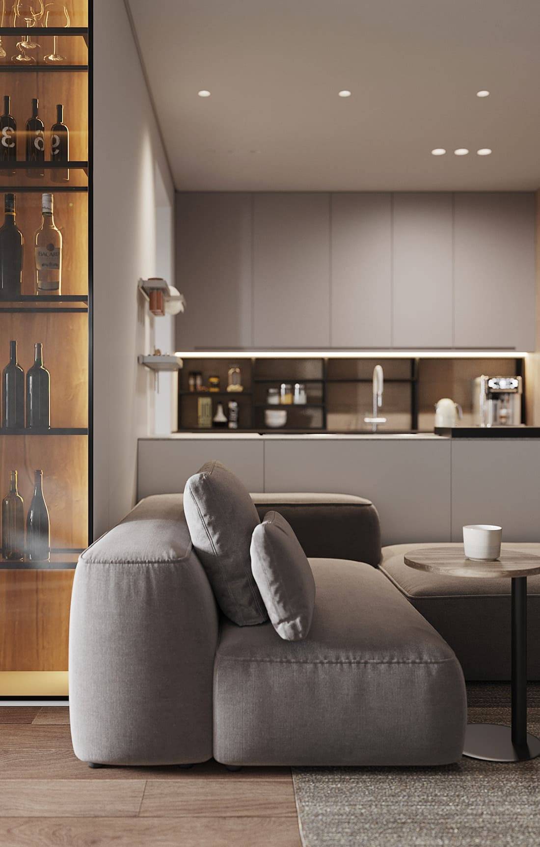 - Примыкание к острову. Если остров служит исключительно местом для приготовления и приёма пищи, диван становится гармоничным продолжением всей конструкции. Нередко остров комбинируется с барной стойкой, тогда высокая спинка дивана будет обладать особой выразительностью;