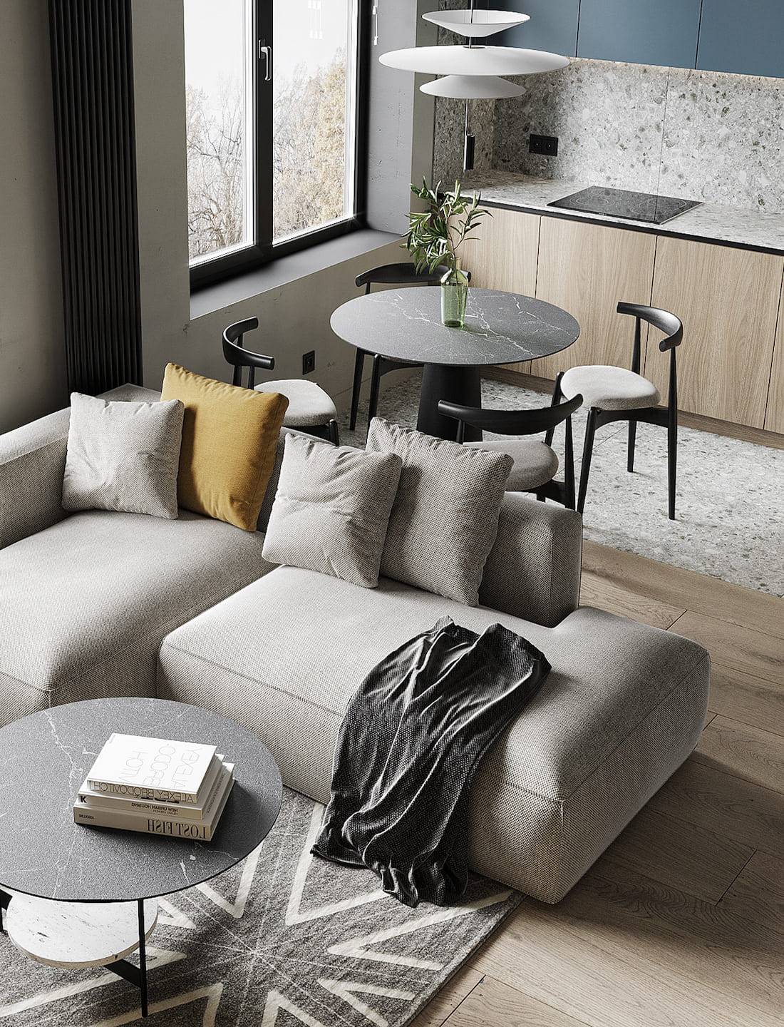 Кухонный остров уже служит точкой выделения функциональных зон, поэтому диван в данном случае выступает скорее, как сопутствующая мобильная составляющая.