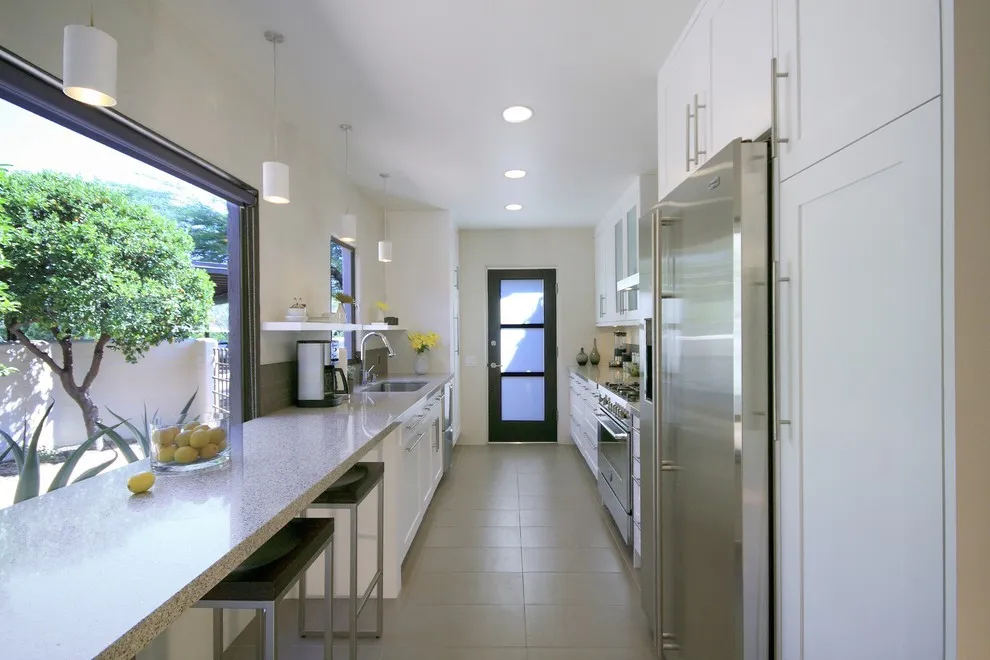 Если кухня имеет вытянутое исполнение, а окно располагается на короткой стене, его можно задействовать под П-образную рабочую зону или поставить возле него небольшой столик.