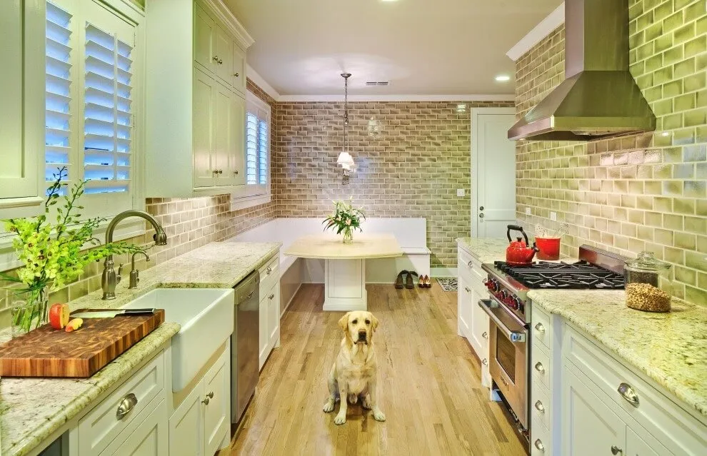 - Чтобы выделить зону столовой от рабочей, используют уже не кирпич, а влагостойкие листы гипсокартона. Финишная отделка – покраска стен водоэмульсионной белой, молочной или светло-серой краской.