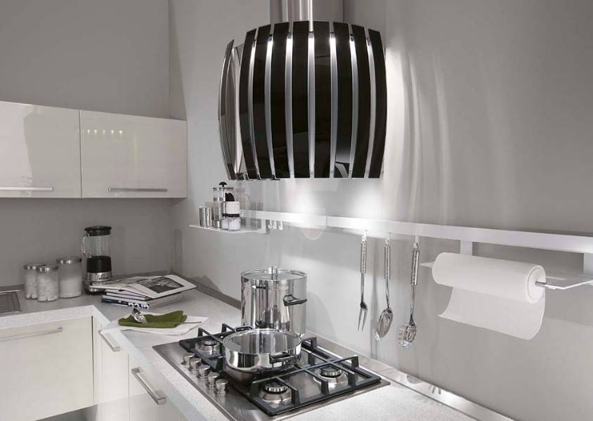 Наклонная вытяжка с изогнутой формой полусферы внесет в современный дизайн кухни геометрический акцент