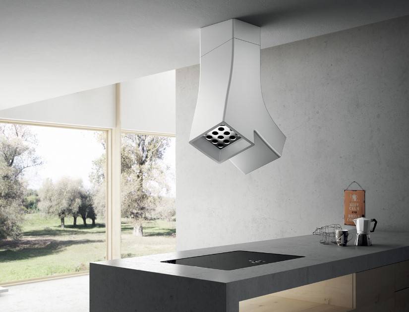 Напоследок стоит привести некоторые кухонные вытяжки, фото которых живьем не часто встретишь в традиционных интерьерах: Яркий пример оригинальных моделей «островного» форм-фактора, который, пожалуй, сегодня наиболее разнообразен.
