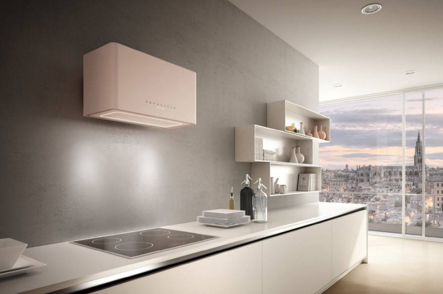 Прекрасным решением станут рубрики и стеклянные устройства объемных размеров. Их глянцевая черная или белая поверхность легко комбинируется с украшением яркими матовыми цветами. Чтобы наполнить помещение домашним теплом и уютом, дает бежевая вытяжка, ее панели не будут выглядеть броско, и красиво подчеркнут обзор и оттенки мебели.