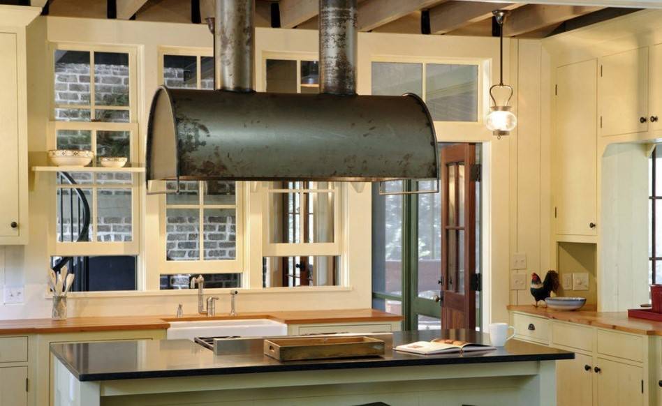 Островная раздвоенная вытяжка Можно встретить вытяжку и в совершенно другом обличии, которая вполне впишется в оригинальный лофт или кантри-стиль.