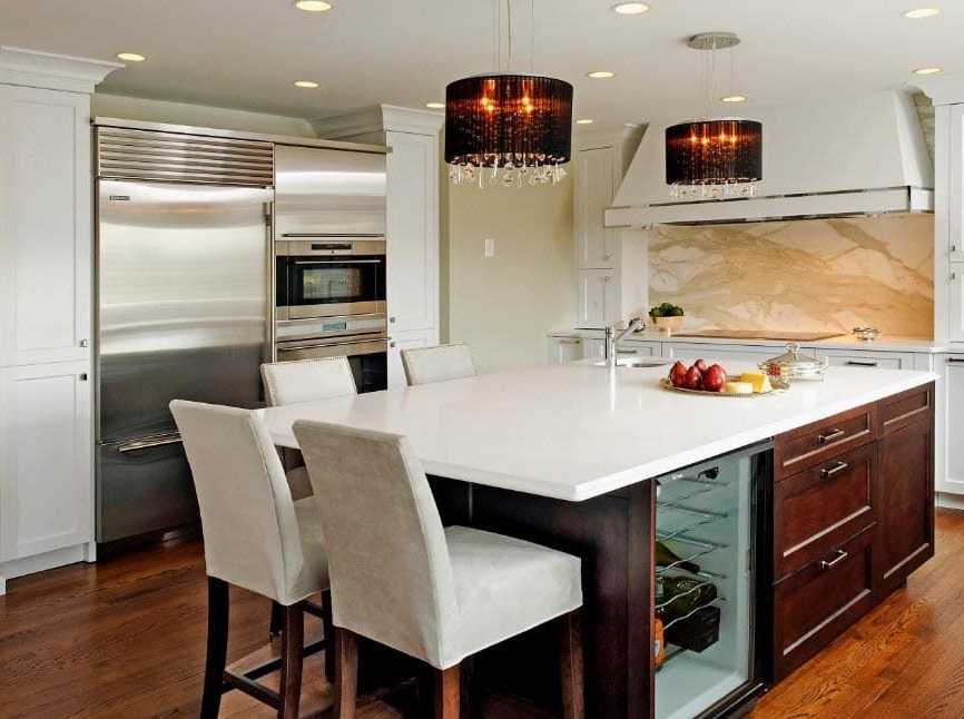 Продлевая столешницу кухонного острова и оставляя свободное пространство для ног в его основании, можно получить очень удобное место для проведения коротких трапез, таких как завтрак. Для домов или квартир, где нет маленьких детей и пожилых людей. Подобные стойки с барными стульями могут выполнять функции обеденных зон, если отдельного помещения для столовой нет и все домочадцы не против проводить время за трапезой, сидя на высоких барных стульях или табуретах. Если планируется проводить за столешницей кухонного острова не только завтраки, но и принятие пищи в другое время дня, можно рассмотреть возможность установки мини-кресел или барных стульев со спинками и мягкой обивкой.
