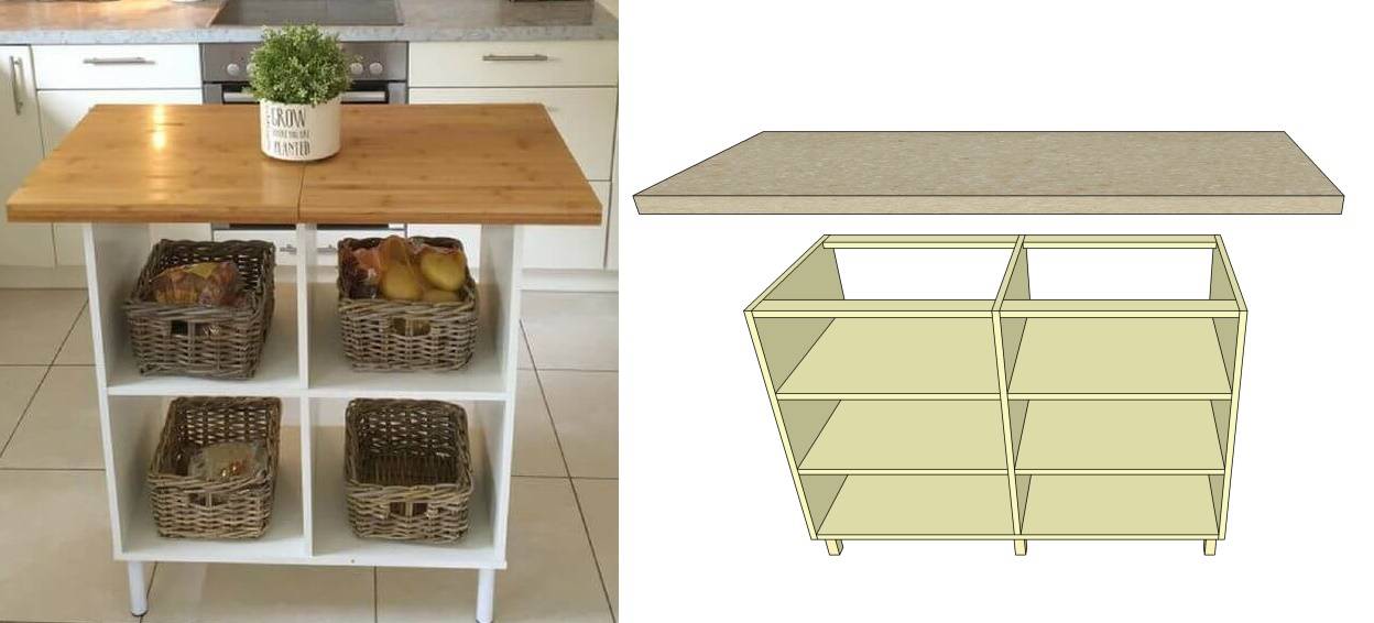 На этот же каркас можно встроить выдвижные ящики, какие-то полки закрыть дверцами – в итоге получится комбинированный кухонный остров своими руками. Обычно функциональные полки и ящики располагают со стороны кухонного гарнитура, а противоположную сторону закрывают глухой стенкой или оставляют нишу (свес столешницы) для того, чтобы было удобнее сидеть.