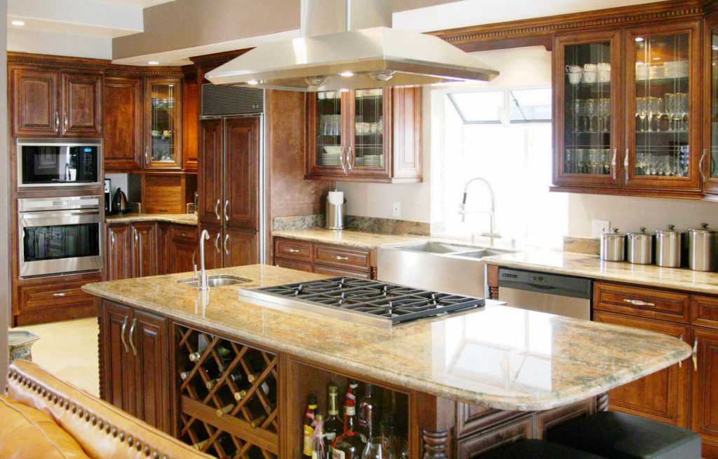Дизайн кухни с островом подходит больше для загородных домов. Благодаря большой площади, есть возможность использовать натуральные материалы любых расцветок. Чтобы кухонный гарнитур выглядел визуально легче, воздушнее, применяют светлые тона и теплые оттенки. Для создания камерной, стильной домашней атмосферы применяют темные цвета, дерево, кованые детали.