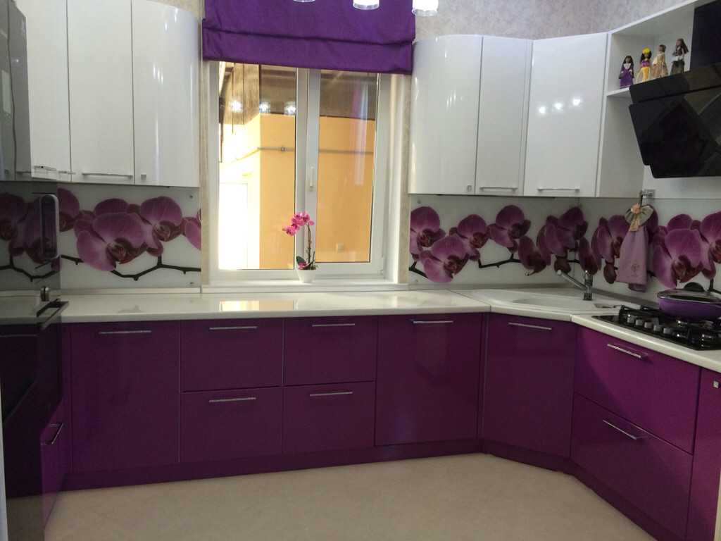 На фото: Интерьер с глянцевым гарнитуром в ярком цвете