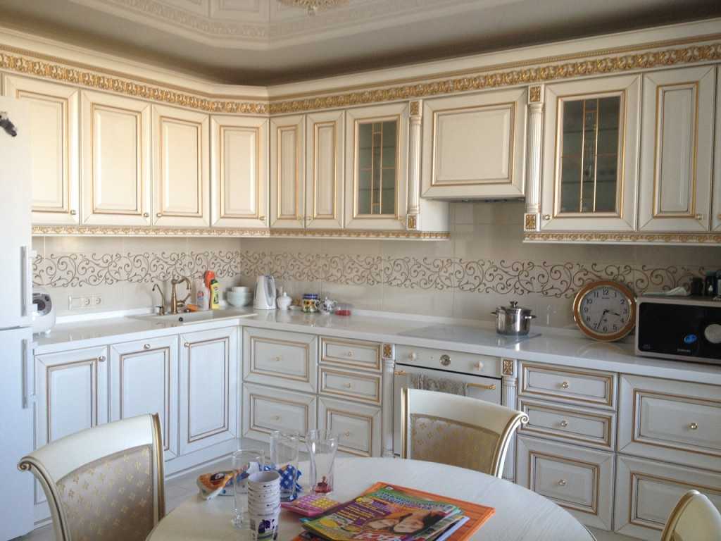 - В случае, когда отступ от потолка до шкафчика сравнительно небольшой – оформляем зазор потолочным плинтусом. Закрыв этот просвет, вы украсите фасад кухни и предотвратите накопление пыли на поверхности шкафа.