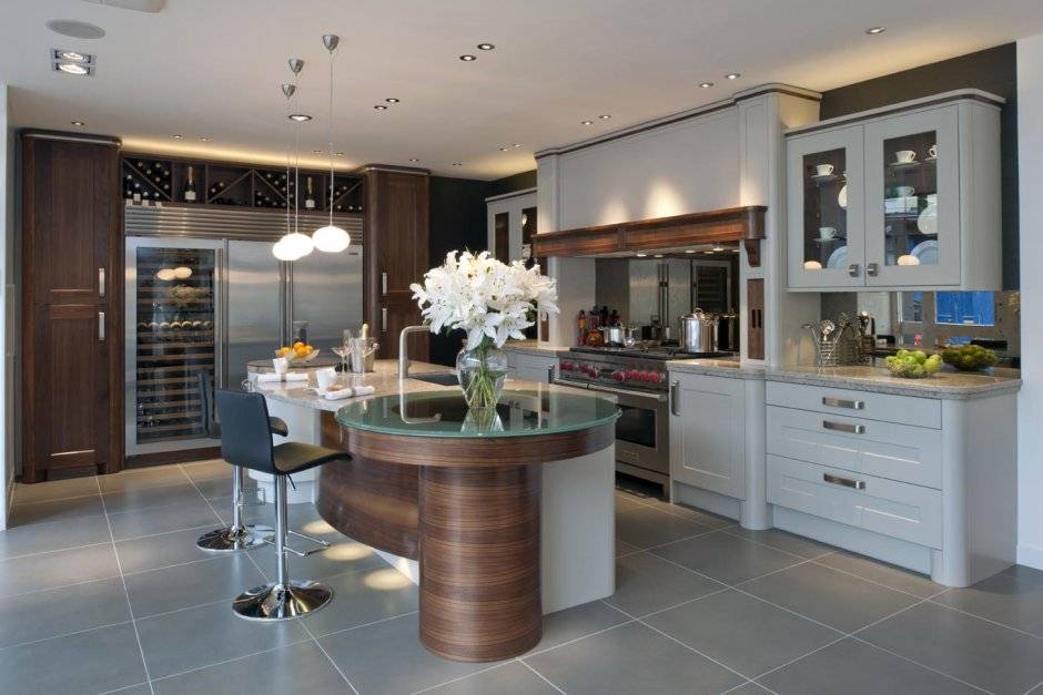Минимализм и современные технологические направления потребуют гладких фасадов без ручек и строгих прямоугольных форм. Вместе с тем современный романтизм и модерн активно используют овальные, полукруглые и круглые острова.