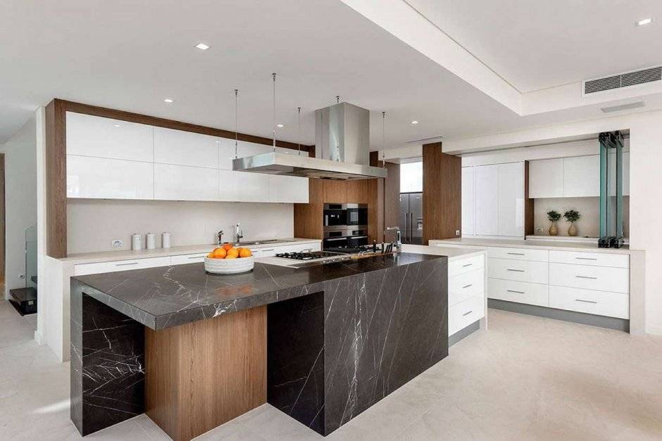 В современном стиле минимализм кухня с островом выглядит визуально легко, присутствует много однотонных деталей, натуральных материалов. Островная конструкция имеет четкие очертания, прямоугольника или квадрата. Столешница тонкая, часто из камня или акрила. Внутри устанавливают закрытые ящики, оборудованные системой push to open, без ручек.