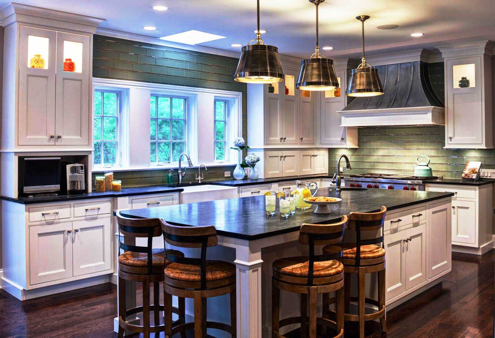Просторная островная кухня в классическом стиле выглядит роскошно. Из материалов здесь используют древесный массив или камень для островной конструкции. Столешница из гранита, мрамора или оникса придаст помещению солидный вид. Классический остров используют для хранения, в качестве рабочей зоны или обеденного стола. Кухонный гарнитур должен быть симметричным, подойдет П-образная планировка или линейная, островная конструкция устанавливается в центре.