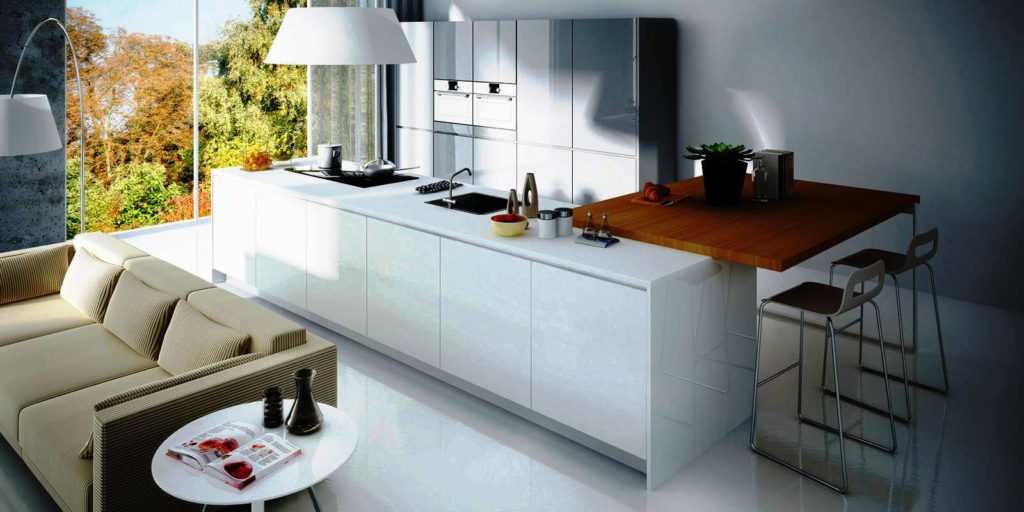 - белые интерьеры не перегружать сложными формами островов. Здесь лучше ограничиться простым гарнитуром. А яркий акцент можно сделать на стенах и декоративных элементах.