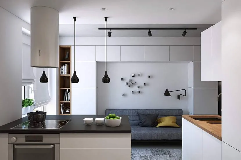 Переходным элементом служит кухонный остров, одна сторона которого относится к рабочей зоне кухни. С другой стороны находятся открытые полки-стеллажи — элемент интерьера гостиной. Диван, мягкий угол, приставленный к кухне с островом, служит разделительной чертой между двумя зонами.