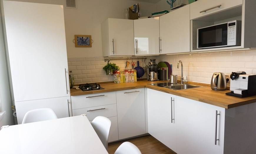 Я не хотела угловую кухню, потому что, делая угол слева, мы получали боковину шкафа сразу при входе, что мне категорически не нравилось — на фото видно, что почти в такой конфигурации кухня была раньше. Не угловая, но там стоял отдельный шкаф, который давал хоть какую-то рабочую поверхность, которая в том гарнитуре отсутствовала. А делая угол справа, мы бы «съели» 20 см окна, поскольку у нас низкие подоконники. А я люблю наши большие окна. Тут я ни о чем не пожалела. Все, что нужно, влезает, есть еще свободное место в шкафах для мелкой техники или еще чего-то. Я не храню в кухонном гарнитуре овощи и фрукты, это тоже дает больше места под остальные нужности.