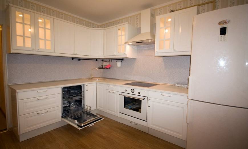 - Посудомоечную машину встраивают не всегда, так как это довольно габаритное устройство. Если есть возможность ее разместить, то покупают самую узкую модель. Ее ширина составляет 45 см.