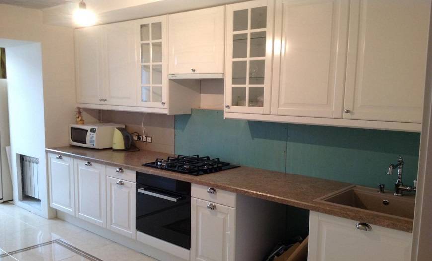 Кухня изготовлена из ДСП или ДВП, которые покрыты акриловой краской. Одноцветность белого интерьера предоставляет широкие возможности для творческого процесса и полета фантазии.