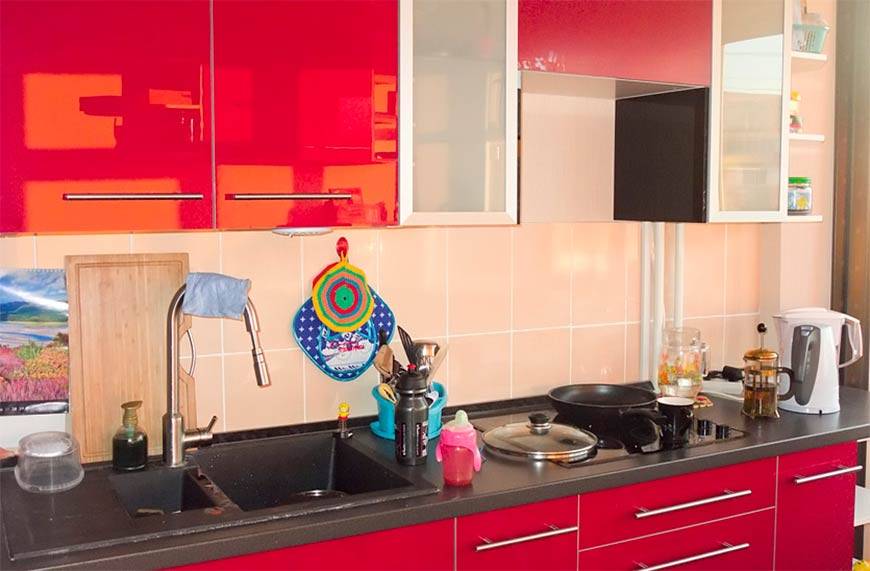 Шкаф с вытяжкой нужно вешать на расстоянии 75см от газовой панели или выше. У нас 60см. Тут двоякий опыт. Вытяжка не сломалась, не греется, фасад над ней тоже не превратился в тыкву. Будбин — это ДВП в краске, с пленкой такого лучше не делать, большая вероятность, что она отслоится. Но пачкается: мыть надо часто, жир летит и прилипает даже при включенной вытяжке. В целом, ничего критичного, но такой нюанс есть.