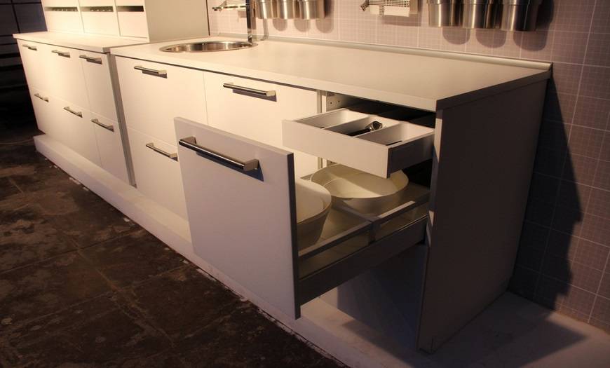 Модули для встраиваемой техники имеют стандартные размеры. Многие шкафы укомплектованы дополнительными отделениями (ящиками, открытыми полками) для хранения посуды, кухонных принадлежностей.