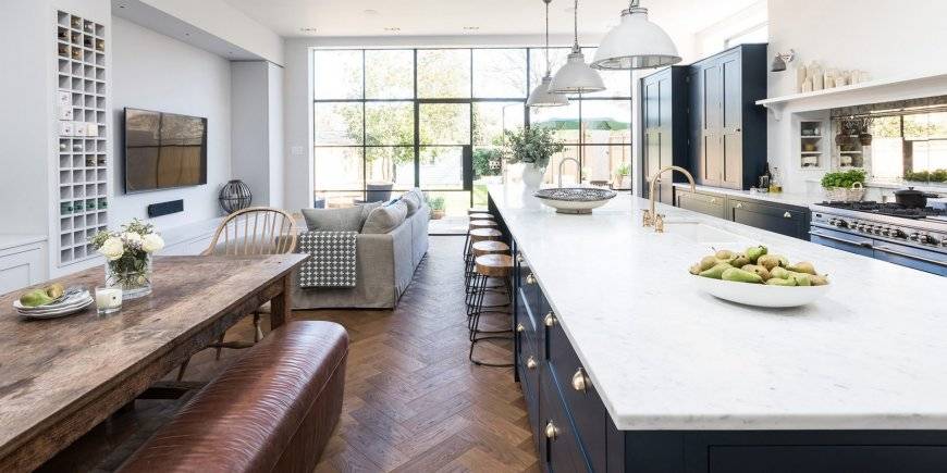 В кухне-гостиной имеет смысл разграничить зоны при помощи длинного острова с выделяющейся барной стойкой. Это удобно, а смотрится весьма необычно. Превратите его в обеденный стол при помощи выступающей столешницы. Из-за габаритов места хватит даже большой семье.